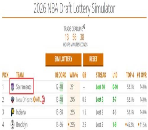国王目前12胜40负联盟倒数第一,2026年前四顺位签52.1%,状元签概率14%。国王很有希望在2026年夏抽中前三顺位。