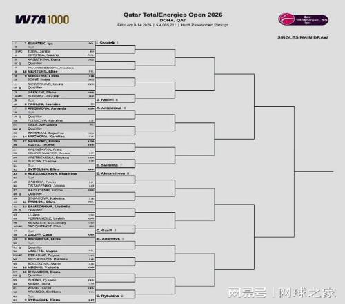 我们再来关注WTA1000多哈站。北京时间昨晚,这站女子1000赛公布了单双打正赛签表。单打前八大种子对位:上半区,斯瓦泰克--鲍里妮、阿尼西莫娃--斯维托丽娜;下半区,亚历山德洛娃--高芙、米拉-安德列娃--莱巴金娜。中国一姐郑钦文抽到了下半区,首战前澳网冠军肯宁。