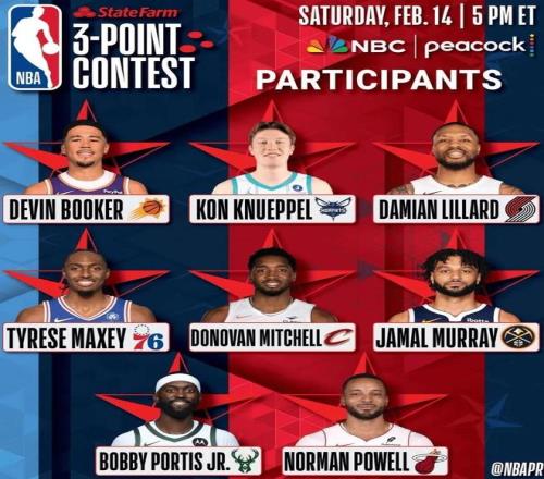 北京时间2月9日,NBA官宣今年全明星三分大赛的8人参赛名单,卫冕冠军布克与已经赛季报销的两届赛会冠军利拉德领衔,还有新秀神射手克努佩尔。