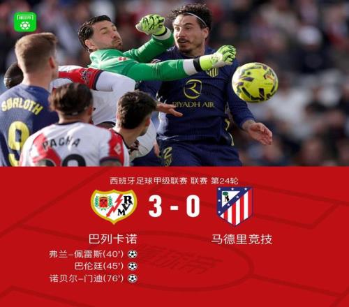 北京时间2月15日西班牙足球甲级联赛 联赛 第24轮,巴列卡诺主场对阵马德里竞技。巴列卡诺弗兰-佩雷斯破门,巴伦廷破门,诺贝尔-门迪破门。最终比分巴列卡诺 3-0 马竞。