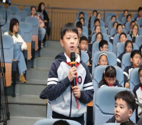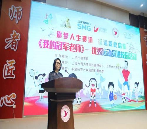 接着同学们来到报告厅,与陈老师开启了一次冠军课堂。华东师范大学第四附属中学党总支书记王萍深情寄语:“体育不仅是强身健体的手段,更是立德树人的载体。陈金洋老师带来的不仅是一堂课,更是一种信念的传递。”她勉励同学们以冠军为榜样,在奔跑中读懂坚持的意义,在汗水中感悟成长的力量,并强调学校始终坚持“健康第一”的教育理念,努力让每一个孩子都能在体育中找到属于自己的节奏与光芒。