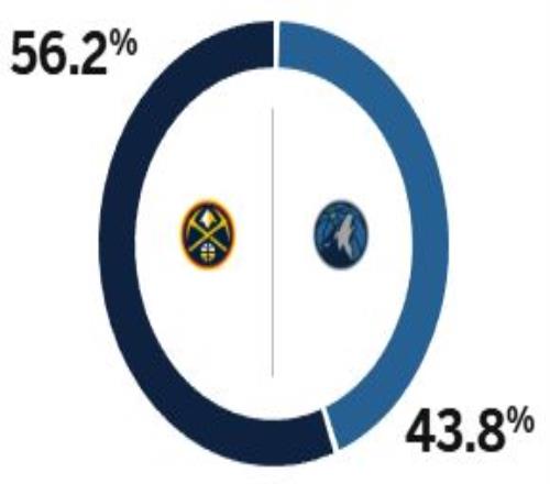 赛前,美媒ESPN预测本场比赛胜率,其中掘金为56.2%,森林狼为43.8%。