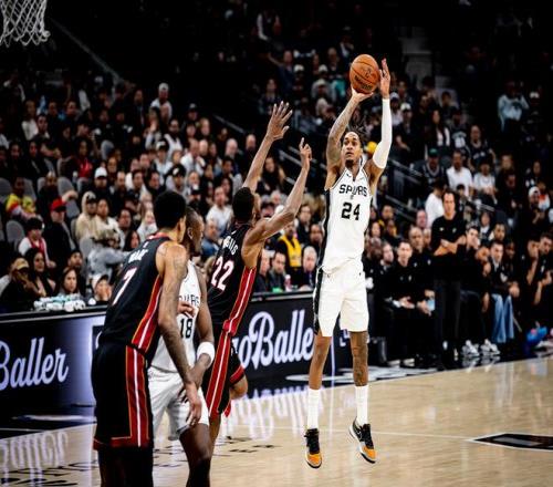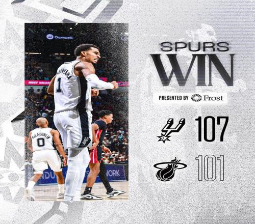 阿德巴约抛投命中,两队远投命中率下滑,文班亚马助攻瓦塞尔轰进三分球,文班亚马远投得分,马刺打出了8比2的攻势稳住局面,迈阿密请求暂停。哈克斯2罚全中,巴恩斯回敬外线得分,阿德巴约勾手取分,巴恩斯2罚全中还以颜色。威金斯失误,卡斯尔轰进三分球,文班亚马大帽米切尔,随后反击上篮得分。马刺重新取得11分领先,威金斯轰进续命远投,文班亚马大帽阿德巴约,阿德巴约回敬三分球,文班亚马2罚1中,阿德巴约远投三不沾,比赛时间走完。最终,马刺以107比101险胜热火,得以拒绝15分逆转。