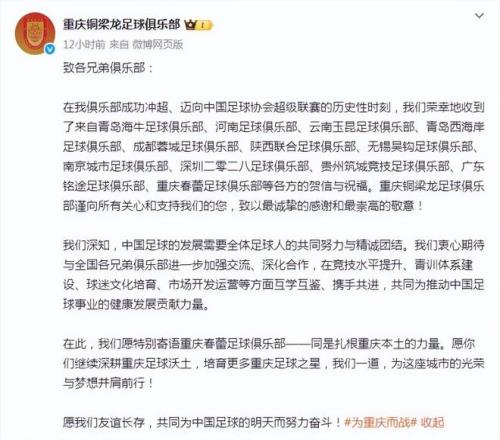 重庆铜梁龙以微弱的优势力压广州豹,惊险冲超,多家俱乐部发来贺电。铜梁龙俱乐部致信向兄弟球队表达了感谢。明年中超来了两个新成员,辽宁德比、成渝德比,令人期待!中甲本土第一射手向余望将在中超赛场上展现自己,跟王钰栋、蒯纪闻、李新翔、刘诚宇、朱鹏宇等新人PK!