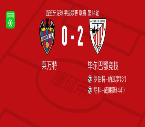 北京时间11月30日,西班牙足球甲级联赛第14轮,莱万特坐镇主场迎战毕尔巴鄂竞技。比赛中,阿莱士-贝伦格尔送出两次助攻,罗伯特-纳瓦罗率先打破僵局,随后尼科-威廉斯再下一城。凭借这两粒进球,毕尔巴鄂竞技客场2比0战胜莱万特。