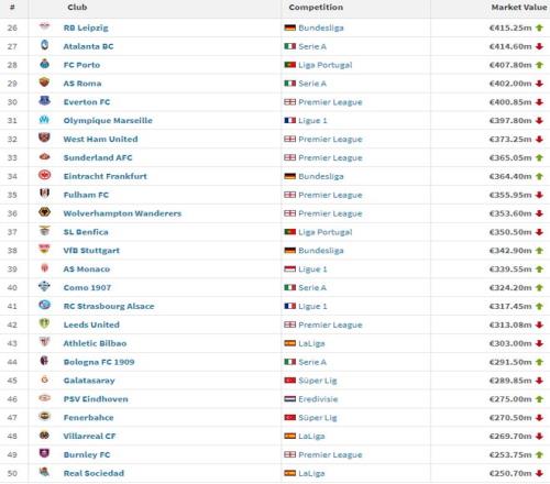 在亚洲球队里,利雅得新月排名最高,以1.92亿排名第62位,其次是吉达国民(第71位,1.63亿)、吉达联合(第87位、1.40亿)以及利雅得胜利(第90位、1.39亿)。