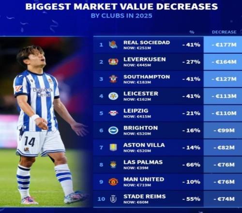 2025球队身价贬值榜:皇社-1.77亿、药厂-1.64亿