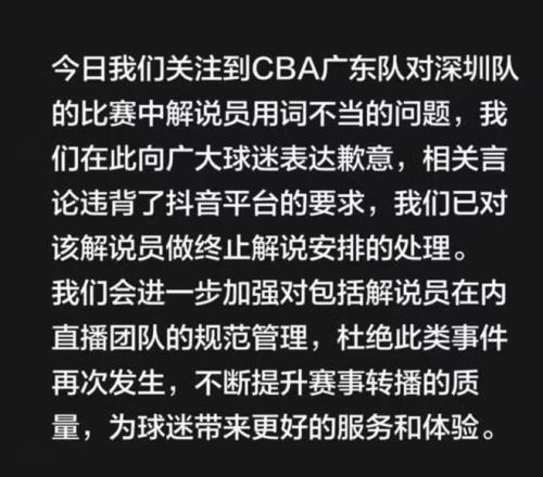 深夜12点!抖音体育公开向广东队道歉,解说员用词不当遭终止解说