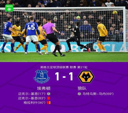 北京时间1月8日英格兰足球顶级联赛 联赛 第21轮,埃弗顿主场对阵狼队。埃弗顿迈克尔-基恩破门。狼队马特乌斯-马内破门。最终比分埃弗顿 1-1 狼队。