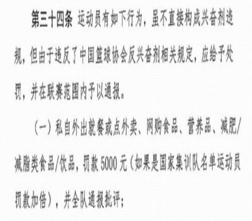 而第三十四条处罚方法中明确指出,私自外出就餐或点外卖、网购食品、营养品、减肥/减脂类食品/饮品,罚款5000元(如果是国家集训队名单运动员罚款加倍),并全队通报批评。