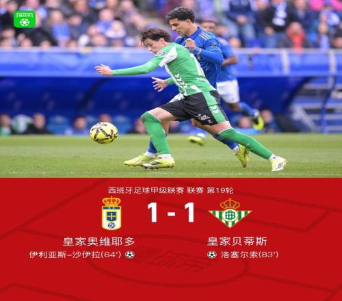 北京时间1月10日西班牙足球甲级联赛 联赛 第19轮,皇家奥维耶多主场对阵皇家贝蒂斯。下半场沙伊拉禁区外贴地斩,之后安东尼传中,洛塞尔索头球破门。最终比分皇家奥维耶多1-1皇家贝蒂斯。