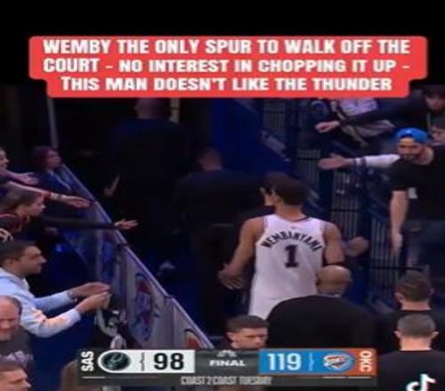 赛后,美媒晒出了双方球员的状态。马刺队当家球星文班亚马第一时间离开了球场,他也成为了唯一一名提前离场的马刺球员,其余的马刺球员仍留在场上与雷霆球员拥抱握手致意。