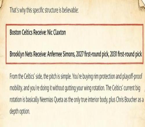 美媒《Fadeaway World》提出了一套3换1的交易方案,建议他们送出安芬尼·西蒙斯、2027年、2031年的首轮签,从篮网引入中锋克拉克斯顿。