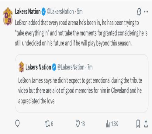 勒布朗-詹姆斯重返克利夫兰的大战,这场比赛之前ESPN分析,这场比赛大概率是勒布朗职业生涯最后一次在速贷球馆打球,因为勒布朗并不想像科比一样搞退役巡演。当克城为他再一次播放致敬视频时詹姆斯动情落泪,41岁的老头子哭得很伤心。