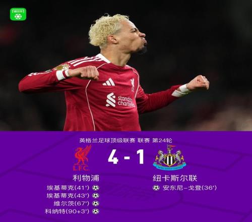 剑南春利物浦41逆转纽卡,埃基蒂克双响,科纳特破门