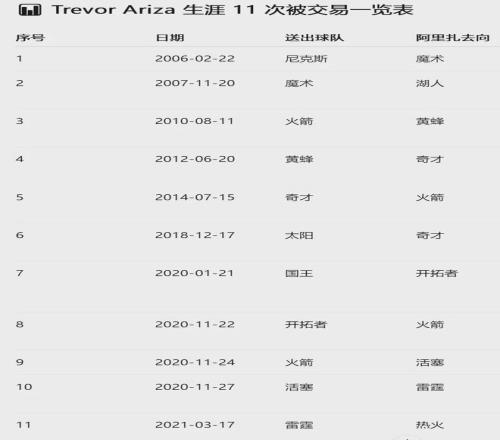 阿里扎至此已经被交易了7次,接下来才是真正的颠沛流离:2020年11月17日,开拓者将阿里扎送回火箭;11月19日,火箭又把他送到活塞;11月21日,活塞将阿里扎送到雷霆。短短四天换了四队!2021年3月18日,雷霆将其送到热火。