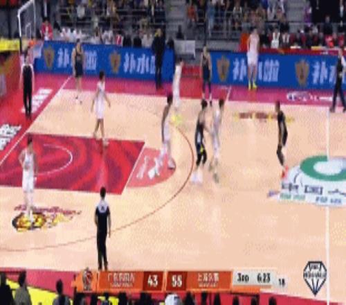 下半场胡明轩重新回来,奎因挨了一帽再送一失误,焦泊乔补篮打进,张镇麟单挑萨姆纳命中翻身后仰,萨姆纳突破制造白边犯规2罚打进,上海3回合攻不进,卢伟光速换上洛夫顿搭档白边,8分01秒,萨姆纳突破再造2+1,一回合后再进超远三分,广东追到13分。