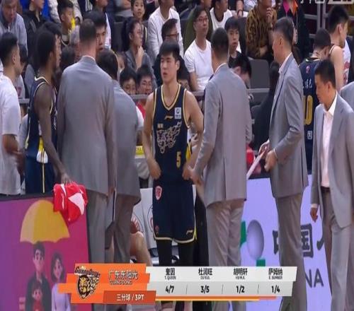 第二节焦泊乔杜润旺被白边打爆,张皓嘉奎因被张镇麟打爆,胡明轩也被杜锋直接弃用,半场广东三分球14中3,单节再输9分,半场落后30-51!奎因6分,萨姆纳16分5板,两人合计8次失误,张镇麟半场三分9中5拿到15分,白边11中7拿到16分8板!
