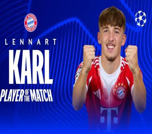 雷速体育10月23日宣 北京时间10月23日03:00,欧冠联赛阶段第三轮,拜仁慕尼黑坐镇主场4-0大胜布鲁日,本场比赛结束之后,为拜仁慕尼黑在第五分钟首开记录的17岁小将伦纳特·卡尔当